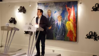 El candidato de IU-Unidad Popular ha pronunciado su discurso de ruptura delante de un cuadro del rey Felipe VI cuando era niño y su padre, el rey Juan Carlos. Sin embargo, ha presumido de haber desterrado "el miedo y las incomodidades" y no estar incómodo ni siquiera en este escenario defendiendo su proyecto republicano. "No nos sentimos incómodos ni con el fondo que tengo detrás, sabiendo en todo caso que uno de los rasgos más simbólicos del nuevo país que defendemos es que estas personas pasen a ser ciudadanos normales y corrientes", ha bromeado.