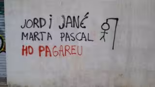 En la pintada aparecen los nombres de Jané y Pascal con la amenaza 'Lo pagaréis' y el dibujo de un muñeco colgado en una horca, y aparece después de las detenciones por parte de los Mossos d'Esquadra de independentistas investigados por quemar fotos del Rey, por orden de la Audiencia Nacional después de desoír una citación judicial.