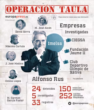 En total, ese día fueron detenidos 24 personas --entre ellos el expresidente del PP en la provincia Alfonso Rus--, se embargaron 150 vehículos de alta gama y bloquearon 252 cuentas corrientes.