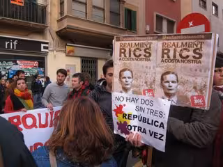 'No hay dos sin tres, la República otra vez' y 'Aquí estamos nosotros que no robamos' son algunos de los gritos más coreados por los manifestantes, que portan pancartas con distintos lemas, como 'Nóos has robado'; 'Iñaki Urdangarin nos debe dinero'; 'Cristina suelta la pasta'; Urdangarin que curre en Burger King'; 'La monarquía es una porquería' y 'Tanto privilegio y tanta nobleza, el pueblo en la pobreza'.