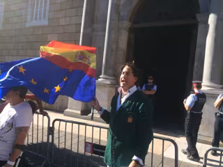 Marichalar se concentró ante la sede del Gobierno catalán a favor de la unidad de España con una pancarta con la leyenda 'Stop al 3% en toda España', una bandera española y otra europea, encarándose a los concentrados.