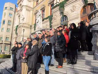 Representantes de la iniciativa Egin Dezagun Bidea, acompañados de miembros de los distintos colectivos que se han adherido a la marcha como la secretaria general de LAB, Ainhoa Etxaide, el dirigente histórico de la izquierda abertzale Tasio Erkizia, o el portavoz de Alternatiba, Oskar Matute, se han reunido este jueves en las escalinatas del Ayuntamiento de Bilbao para hacer un último llamamiento a participar en la marcha.