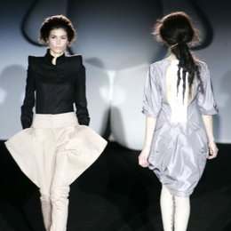 La diseñadora burgalesa complementa sus propuestas transgresoras con adornos como cristales sobredimensionados, racimos de bolas o aplicaciones reflectantes. En cuanto a los materiales, opta por propuestas orientales como el punto de cashmere, el mikado y el gazar de seda, el tafetán de seda con metal o las tramas de lana de Mongolia cardada.