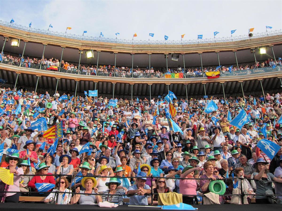 Si el pasado sábado el presidente del Gobierno, José Luis Rodríguez Zapatero, llenó esta misma plaza de toros con simpatizantes y militantes socialistas, los 'populares' han querido tres días después hacer una exhibición de fuerza. Camps ya dijo el sábado que el Partido Popular "reventaría" el coso en el acto con Rajoy.