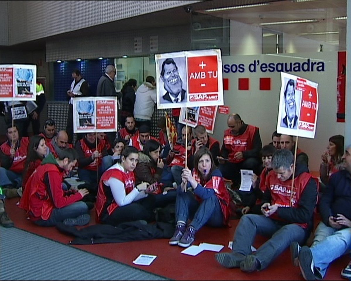 Unos cincuenta agentes de los Mossos d'Esquadra ocupan desde las 11.00 horas de este viernes la comisaría de Plaza España de Barcelona en protesta por los recortes anunciados por la Consejería de Interior.