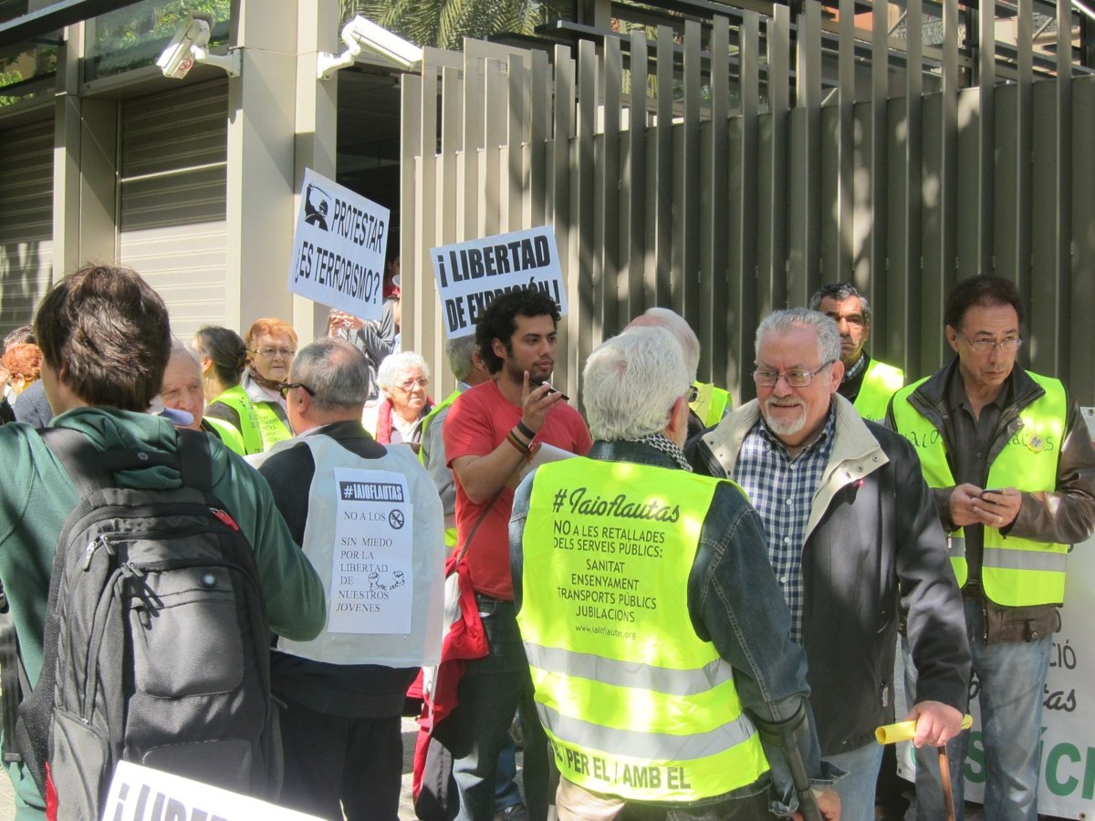 Unos 50 'yayoflautas' han irrumpido sobre las 11 horas de este jueves en la Consejería de Interior de la Generalitat contra los recortes presupuestarios, en defensa de los derechos civiles y contra el encarcelamiento de detenidos durante la huelga general del 29 de marzo.