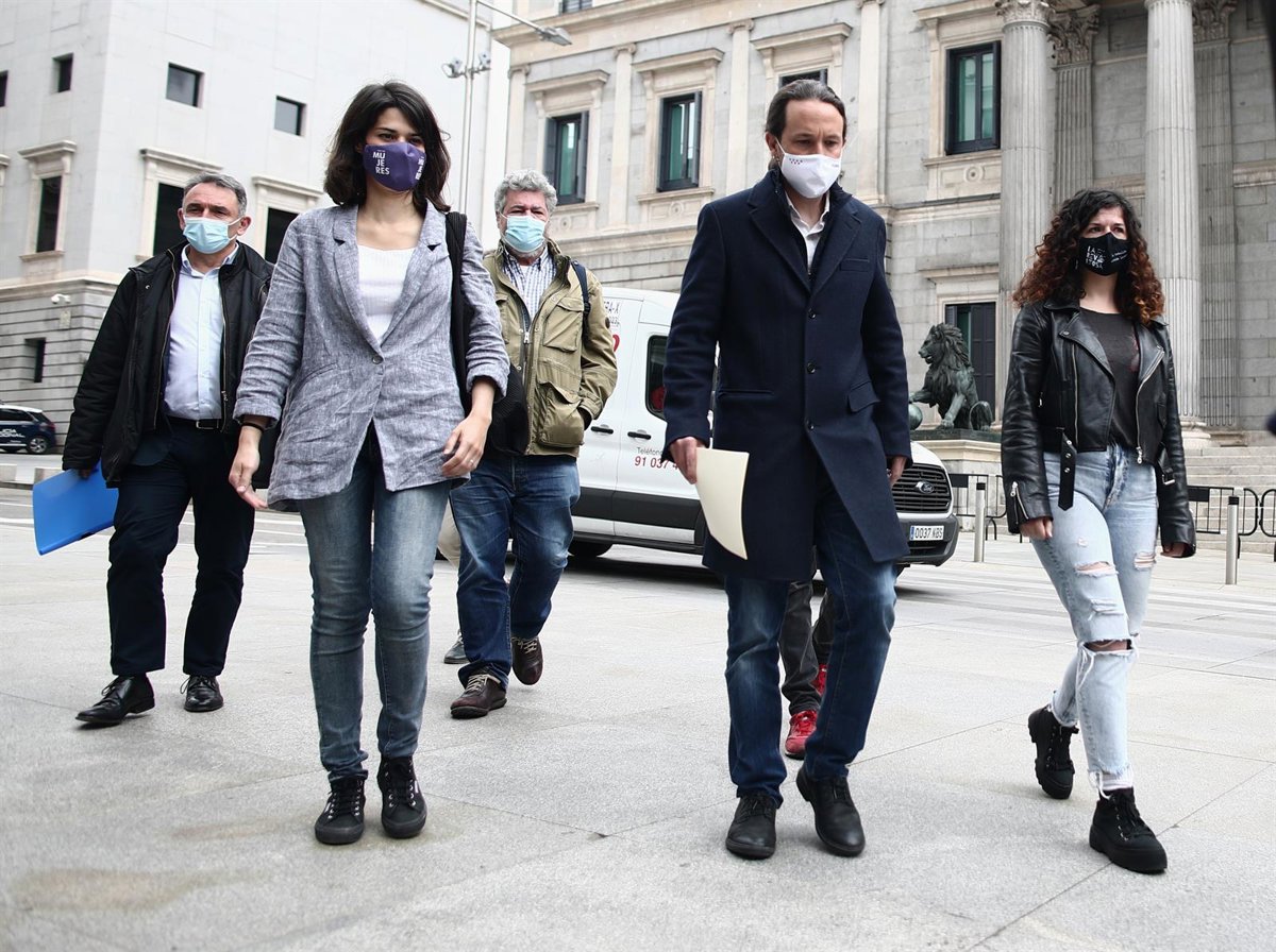 El candidato de Unidas Podemos a la Presidencia de la Comunidad de Madrid y secretario general de Podemos, Pablo Iglesias (centro), acompañado de la 'número 2' del partido para las elecciones a la Asamblea de Madrid, Isa Serra (2i); de la diputada del p - Eduardo Parra - Europa Press