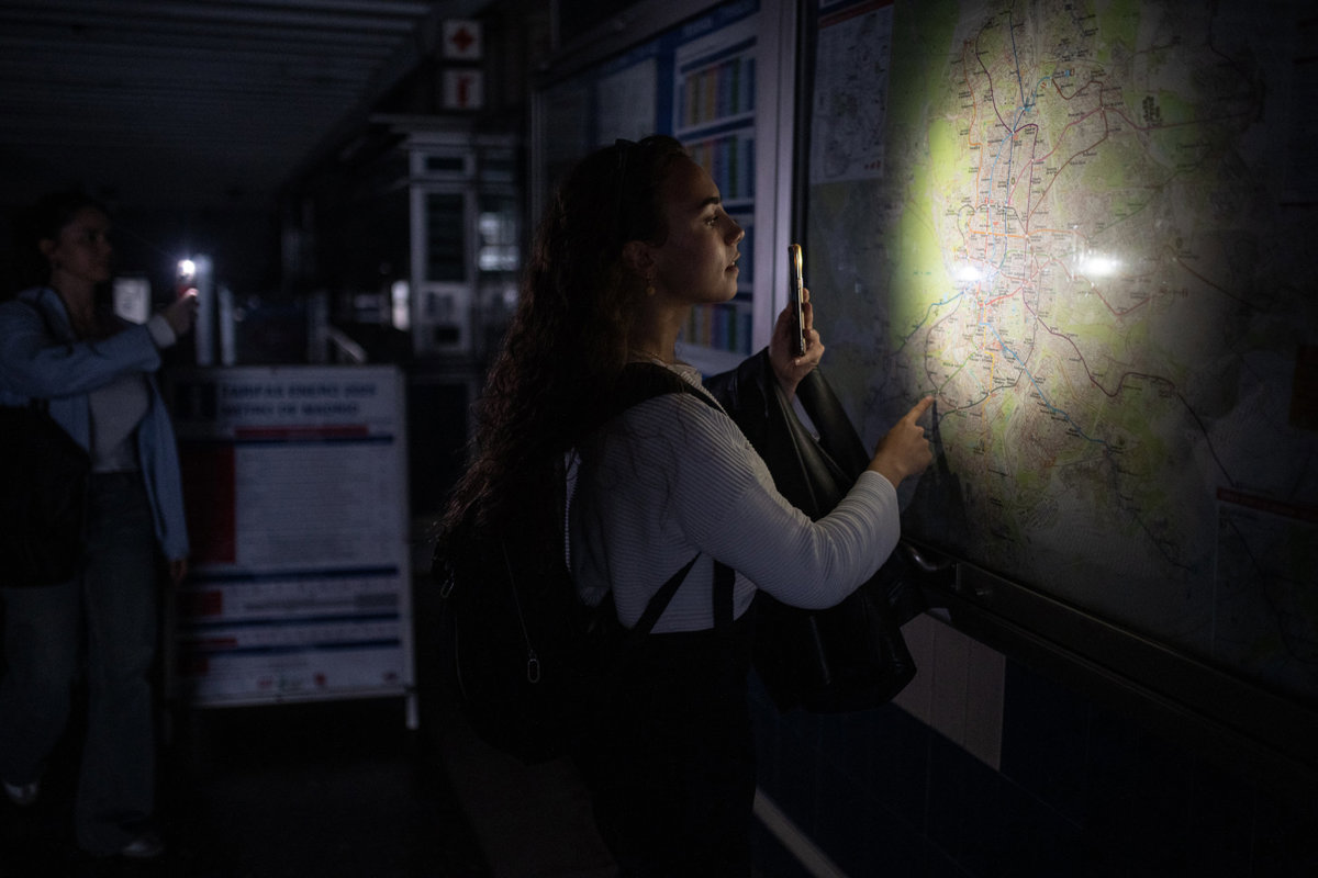Una mujer ilumina con la linterna del móvil un plano de la red de Metro de Madrid en una estación, el 28 de abril de 2025 en Madrid, España.