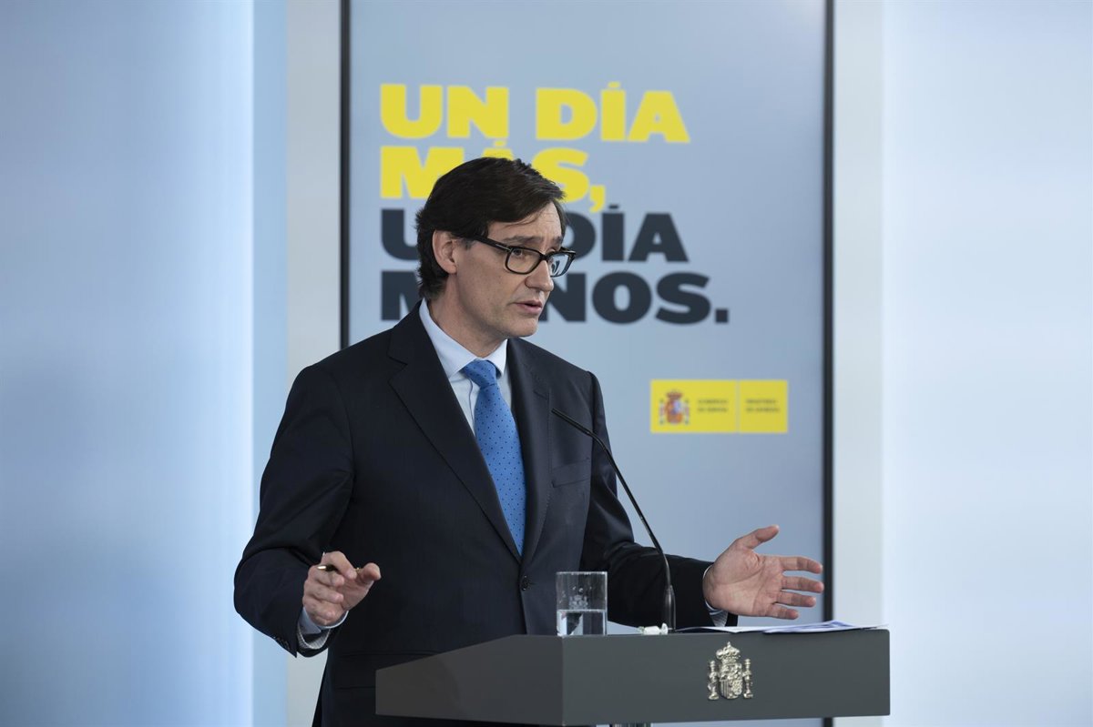 El ministro de Sanidad, Salvador Illa, durante la rueda de prensa posterior al Consejo de Ministros celebrado en Moncloa el día 66 del estado de alarma. En Madrid (España), a 19 de mayo de 2020. - Moncloa