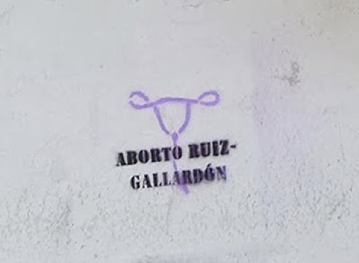 Fuentes municipales han informado a Europa Press de la aparición en una de las fachadas de la vivienda --en la que vive habitualmente el suegro de Ruiz-Gallardón, el exministro franquista José Utrera Molina-- de estas inscripciones, en las que puede leerse el mensaje "Aborto Ruiz-Gallardón" en letras negras y sobre el fondo de un rosario violeta que adopta la forma de los ovarios y el útero femeninos.