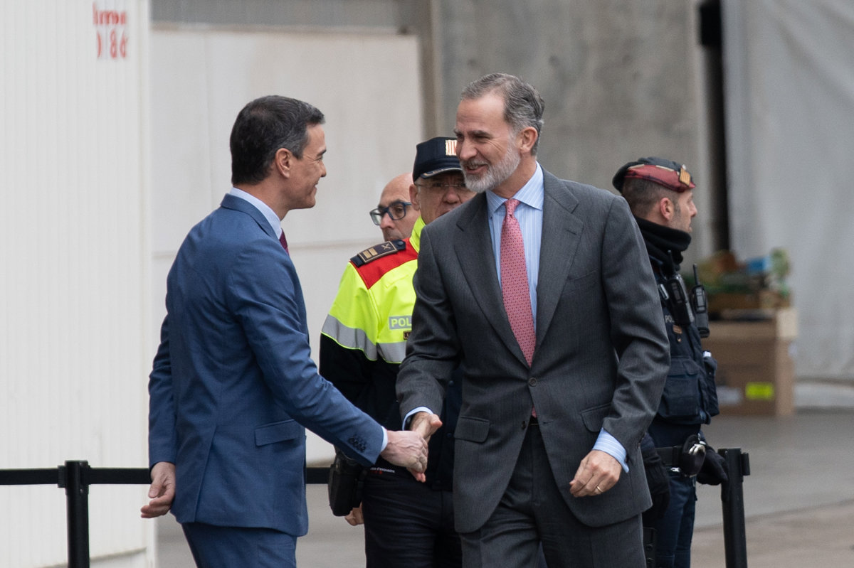 El presidente del Gobierno, Pedro Sánchez (i), saluda al Rey Felipe VI, a su llegada a la inauguración del Mobile World Congress (MWC) 2023, a 27 de febrero de 2023, en L'Hospitalet de Llobregat, Barcelona, Catalunya (España). - David Zorrakino - Europa Press