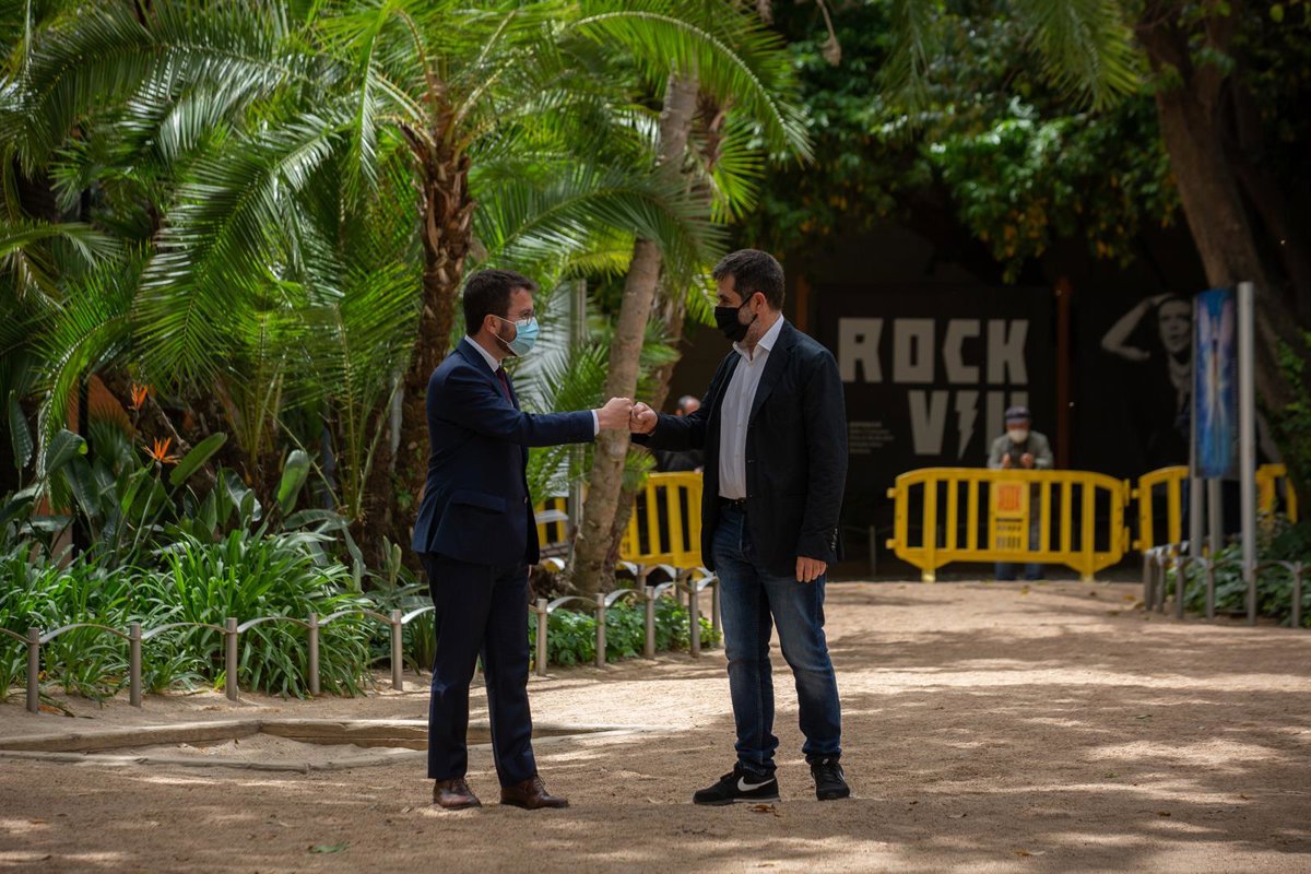 El president de la Generalitat en funciones, Pere Aragons (i) y el secretario general de Junts, Jordi Snchez (d) durante su acuerdo en los jardines del Palau Robert, a 17 de mayo de 2021, en Barcelona. - David Zorrakino - Europa Press