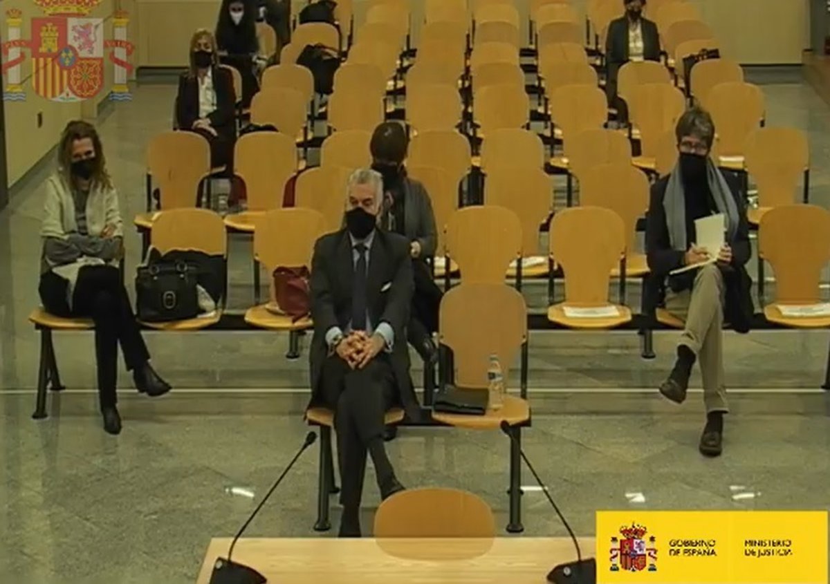 Bárcenas se sienta en la primera fila del banquillo de los acusados. La fila de atrás está ocupada por los también acusados el responsable de Unifica, Gonzalo Urquijo, su socia Belén García y la empleada de esta empresa Laura Montero, que guardan las distancias de seguridad.
