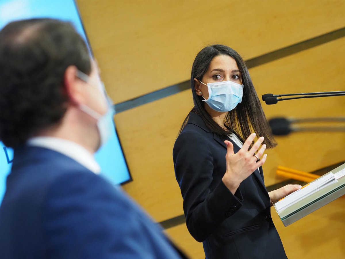 La presidenta de Ciudadanos, Inés Arrimadas, interviene en una rueda de prensa posterior a una reunión con el presidente de la Junta de Castilla y León, Alfonso Fernández Mañueco (i), a 6 de abril de 2021, en Valladolid, Castilla y León (España). - Photogenic/Claudia Alba - Europa Press