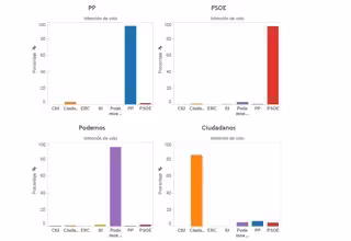 El 85,3% de los que votaron al PP, el 78,4% de losvotantes del PSOE, y el 84,1% de los de Podemos y sus coaliciones tienen intención de votar ahora al mismo partido.