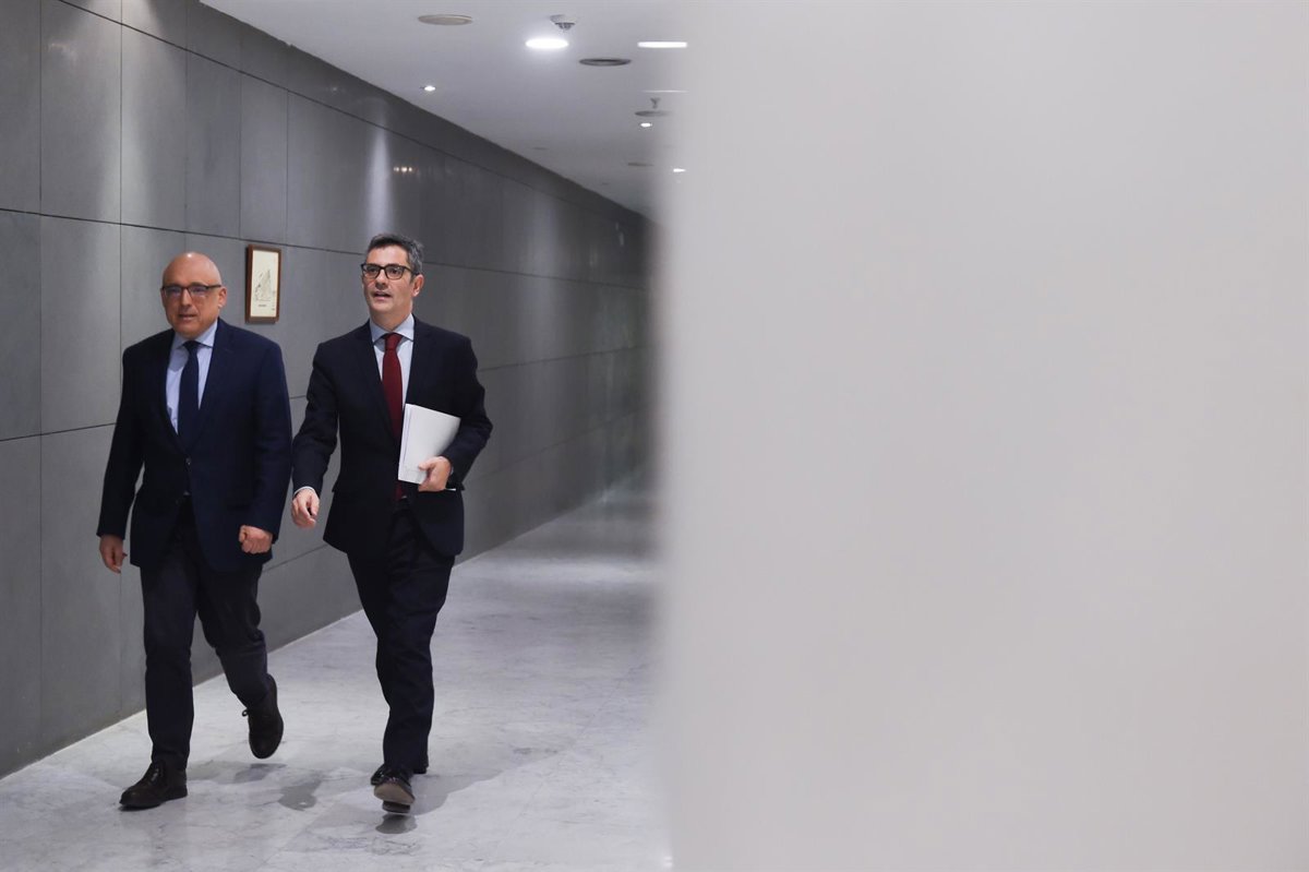 El ministro de la Presidencia, Félix Bolaños (2i), a su llegada a una rueda de prensa tras registrar la ley de amnistía. - Gustavo Valiente - Europa Press