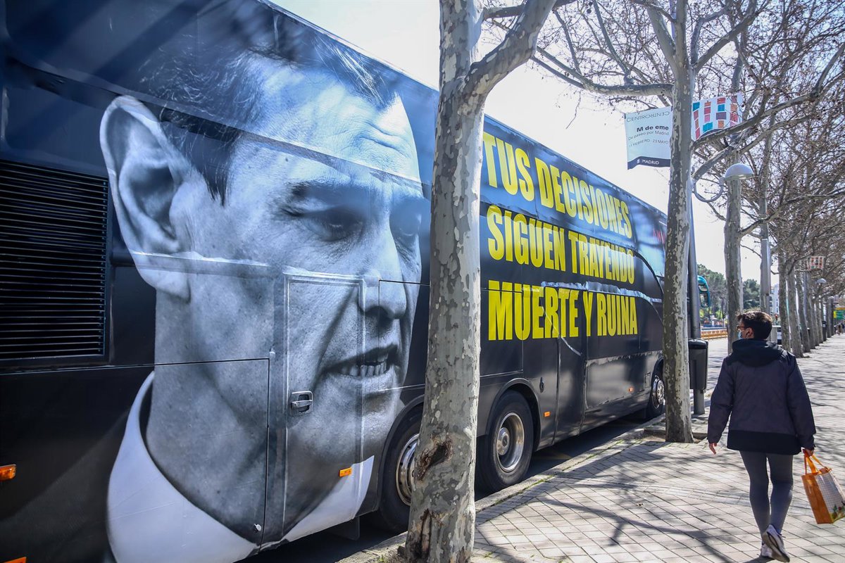 La Asociación Nacional de Víctimas y Afectados por Coronavirus (ANVAC), colectivo próximo a VOX, ha aparcado este jueves un autobús negro cerca del madrileño Parque del Retiro con el que pretenden denunciar las decisiones del jefe del Ejecutivo, Pedro Sánchez, que, según dicen, "siguen trayendo muerte y ruina".