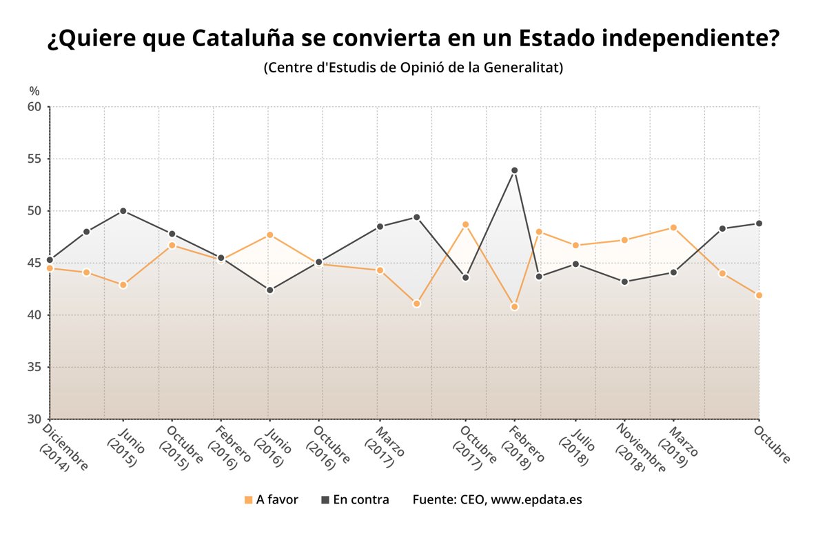 Respecto a la última encuesta del CEO de julio de este año, la tendencia se mantiene incrementando la distancia entre detractores a la independencia y favorables: en esa encuesta el 48,3% optaban por el 'no', y el 44% por el 'sí'.