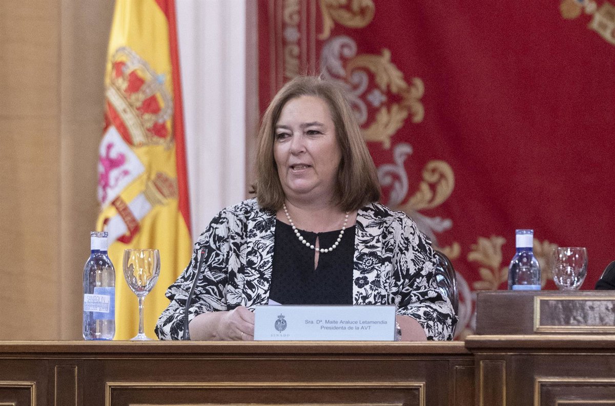 La presidenta de la AVT, Maite Araluce, interviene durante el acto 'Por un final del terrorismo sin impunidad' en el Senado - Alberto Ortega - Europa Press