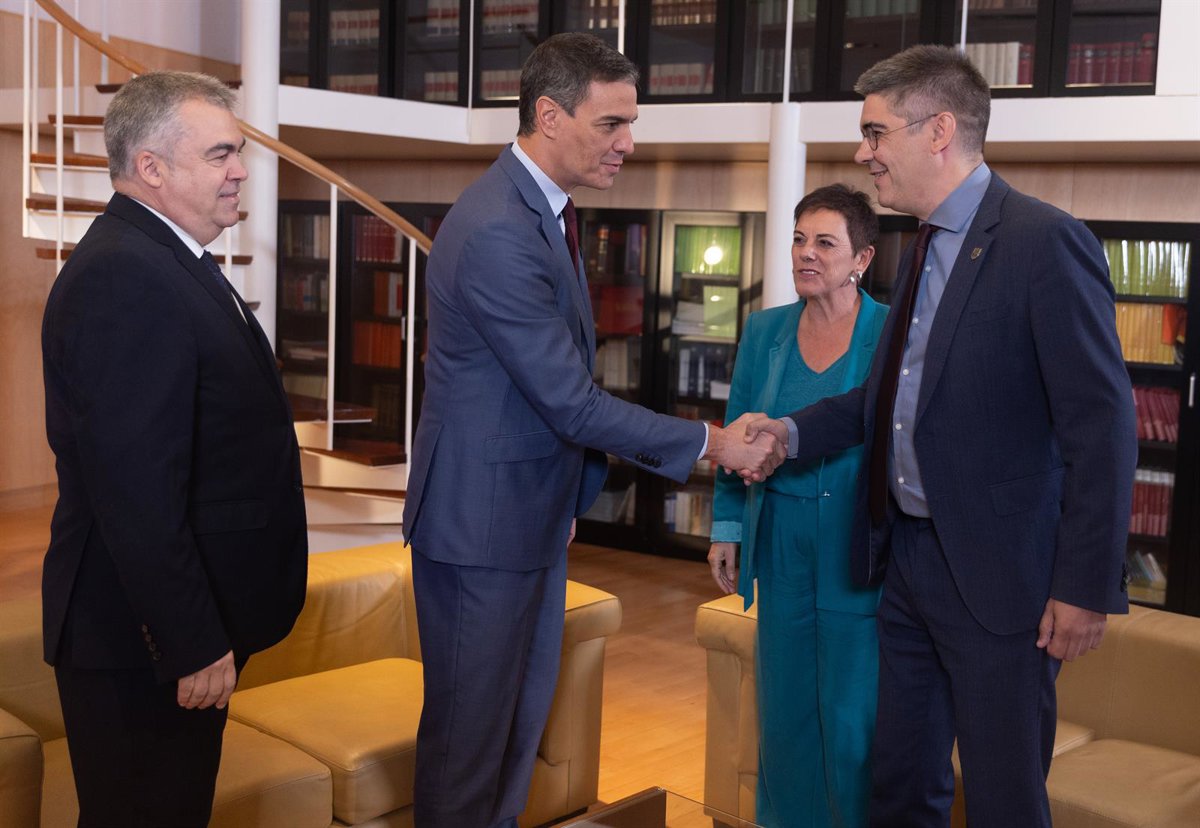 El presidente del Gobierno, Pedro Sánchez, saluda a los portavoces de EH Bildu Mertxe Aizpurua y Gorka Elejabarrieta, junto al secretario de Organización del PSOE, Santos Cerdán - Eduardo Parra - Europa Press
