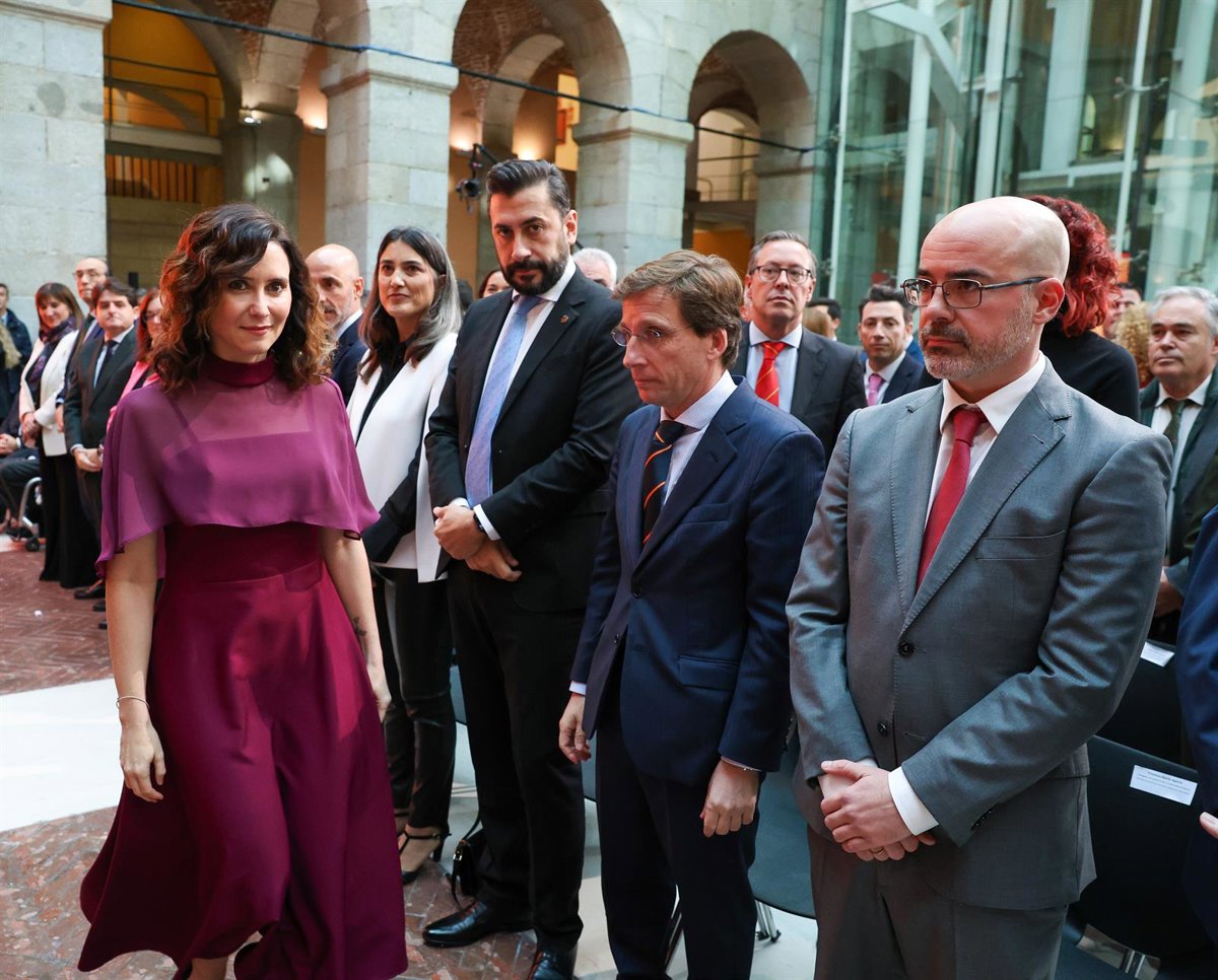 La presidenta de la Comunidad de Madrid, Isabel Díaz Ayuso (1i); el delegado del Gobierno en la Comunidad de Madrid, Francisco Martín (1d), y el alcalde de Madrid, José Luis Martínez-Almeida (2d), durante el acto conmemorativo de celebración del 46º anive - Marta Fernández Jara - Europa Press