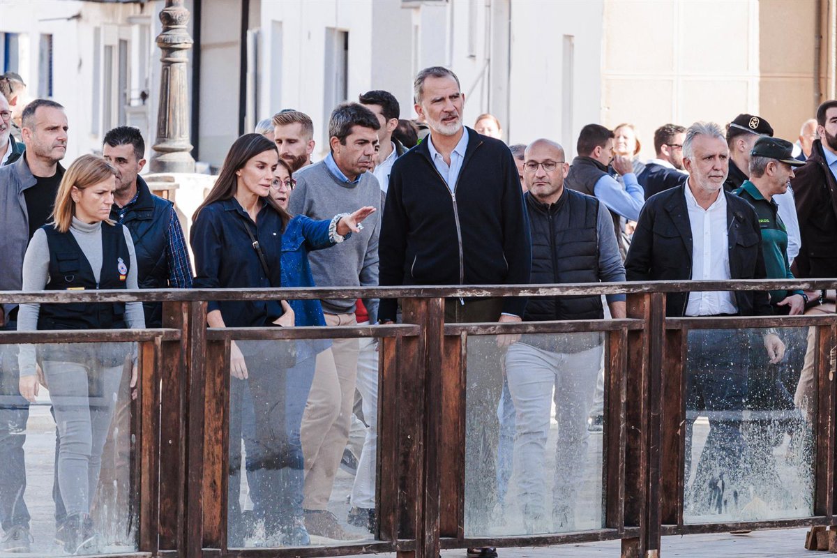 Los Reyes, Carlos Mazón, y el ministro de Política Territorial y Memoria Democrática, Ángel Víctor Torres durante la visita a la localidad de Chiva - Rober Solsona - Europa Press