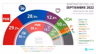 El barómetro del Centro de Investigaciones Sociológicas (CIS) correspondiente al mes de septiembre sitúa al PSOE como el partido con mayor estimación de voto, con un 29,2%, arrebatando al PP la primera plaza que había conquistado por primera vez en la legislatura el pasado mes de julio. En concreto, otorga a los de Alberto Núñez Feijóo un 28,5%. La distancia entre ambos es de 7 décimas lo que, en la práctica supone un empate técnico.