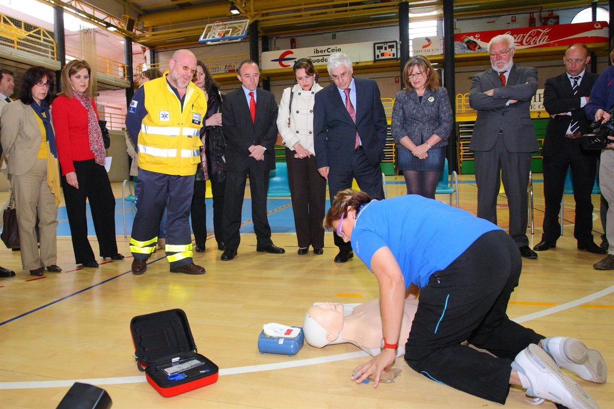 Durante el acto, en el que también estuvieron presentes el consejero de Salud y Bienestar Social, Fernando Lamata, y la delegada del Gobierno regional en Guadalajara, Magdalena Valerio, el presidente presenció una demostración del uso de los desfibriladores cardiacos para atender a una persona con parada cardiorrespiratoria, ejercicio que llevó a cabo Teresa Lozano, una de las trabajadoras del Polideportivo San José que ha participado en el curso de formación impartido por la Gerencia de Urgencias y Emergencias del SESCAM.