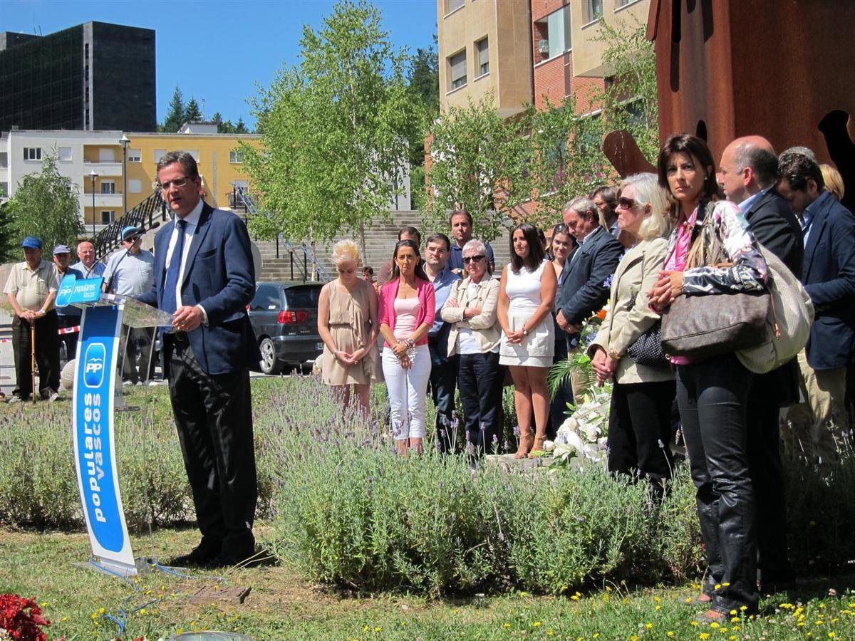 El emotivo acto se ha iniciado a las doce del mediodía, hora a la que militantes populares han depositado a los pies del monolito por las víctimas, sobre el que se había colocado una fotografía de Miguel Ángel Blanco, dos ramos y una corona. Posteriormente, los presentes han guardado un minuto de silencio.