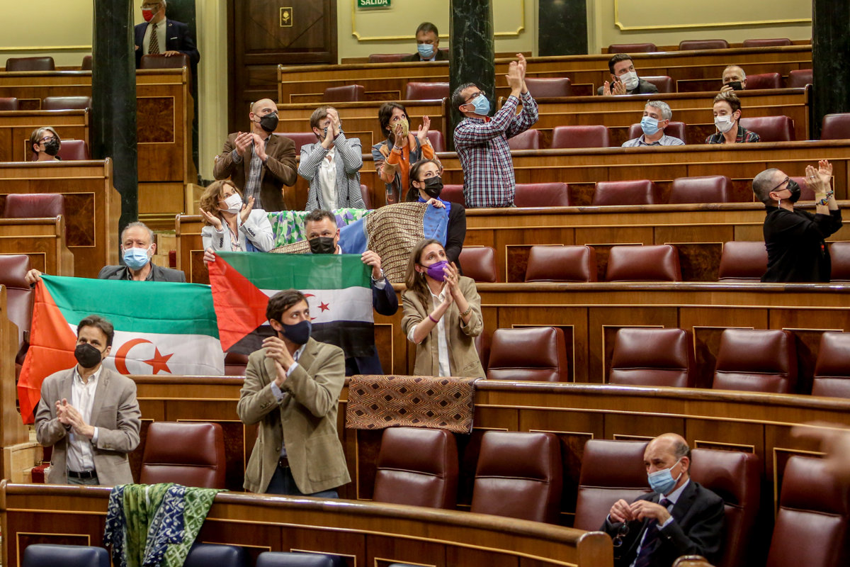 Tras sus palabras, los parlamentarios de Unidas Podemos han desplegado diversas banderas saharahuis y telas que han obligado a la presidenta del Congreso a intervenir para pedirles que las recogieran.
