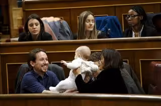 Desde que ha entrado en el hemiciclo de la Cámara Baja y, sin protestar ni llorar ni una sola vez a lo largo de las casi cinco horas de sesión, el pequeño ha pasado de brazo en brazo y ha recibido las carantoñas de diputados de diferentes formaciones, incluyendo las de los compañeros de filas de su madre Pablo Iglesias e Íñigo Errejón.