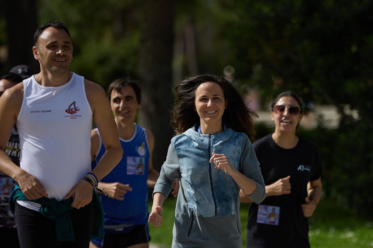 La secretaria general de Podemos y ministra de Derechos Sociales y Agenda 2030, Ione Belarra, y el candidato de Podemos a la Alcaldía de Madrid, Roberto Sotomayor, participan e una carrera en el Parque El Retiro, a 9 de abril de 2023, en Madrid (España) - Jesús Hellín - Europa Press