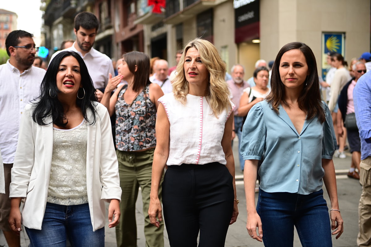 (I-D) La candidata de Sumar por Navarra, Idoia Villanueva; la líder de Sumar, Yolanda Díaz, y la secretaria general de Podemos, Ione Belarra, durante un paseo con los candidatos al Congreso y Senado. - Iván Delgado - Europa Press