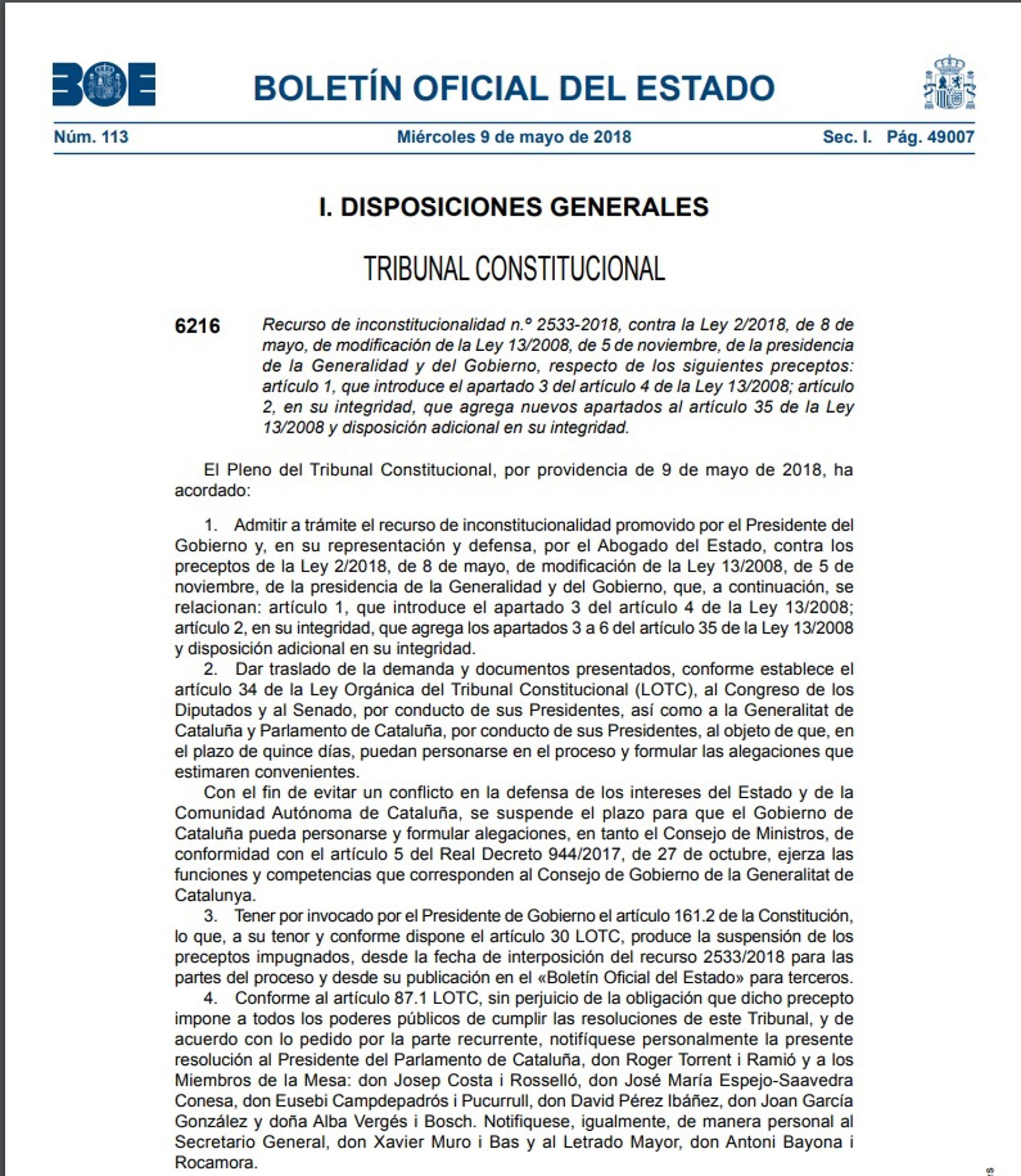 El Boletín Oficial del Estado (BOE) ha publicado este miércoles la suspensión de la Ley de Presidencia de la Generalitat que permitía una investidura a distancia del expresident Carles Puigdemont, procesado por rebelión por el Tribunal Supremo y actualmente huido en Alemania.