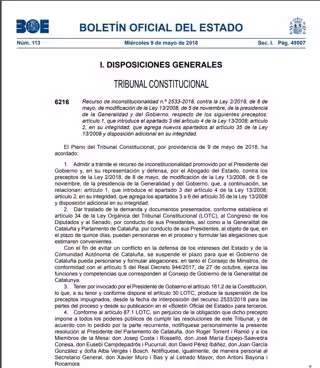 La decisión se ha traslado al Congreso de los Diputados y al Senado, así como a la Generalitat y al Parlamento de Cataluña, para en el plazo de 15 días, puedan personarse en el proceso y formular las alegaciones que estimaren convenientes. Con el fin de evitar un conflicto en la defensa de los intereses del Estado y de la Comunidad Autónoma de Cataluña, se suspende el plazo para que el Gobierno de Cataluña pueda personarse y formular alegaciones.