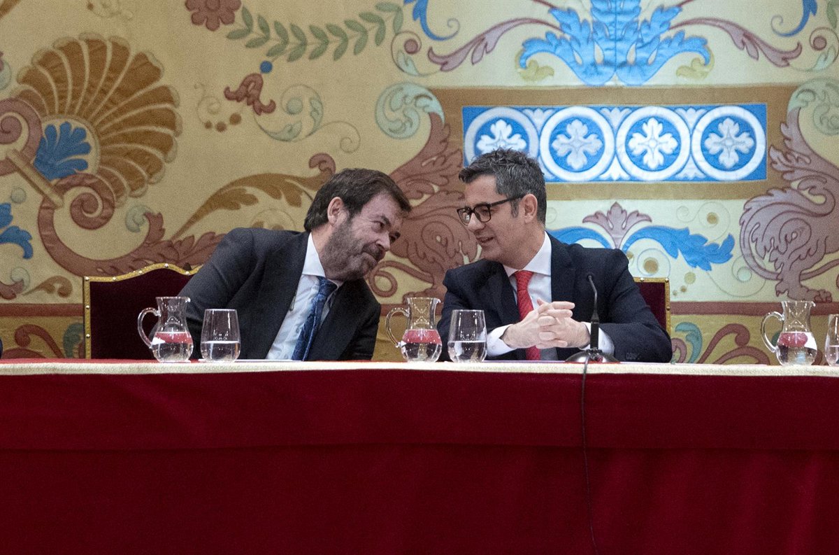 El presidente del Consejo General del Poder Judicial (CGPJ), Vicente Guilarte (i) y el ministro de la Presidencia, Justicia, y Relaciones con las Cortes, Félix Bolaños (d), durante la entrega de despachos a la 61 promoción de acceso a la carrera fiscal - Alberto Ortega - Europa Press