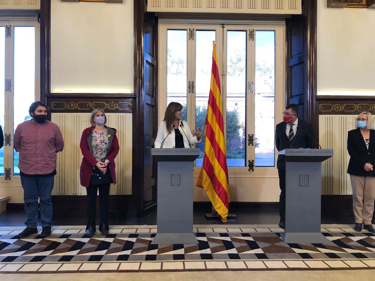 La presidenta del Parlament, Laura Borrs, y el presidente de las Corts Valencianes, Enric Morera, junto con miembros de la Mesa en una declaración institucional - EUROPA PRESS