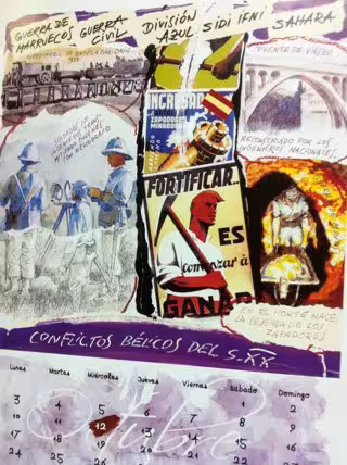 En concreto, el mes de octubre es el dedicado a los "conflictos bélicos del siglo XX". En concreto, la ilustración está encabezada con el recuerdo a la Guerra de Marruecos, la Guerra Civil, la División Azul, Sidi Ifni y el Sáhara. Acompañan a estos conflictos imágenes con carteles de ambos bandos de la Guerra Civil, así como ilustraciones sobre el trabajo de los ingenieros militares durante este siglo.