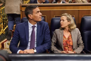 El presidente del Gobierno en funciones, Pedro Sánchez y la vicepresidenta primera y ministra de Economía y Transformación Digital en funciones, Nadia Calviño, durante la segunda votación de la investidura del líder del Partido Popular, en el Congreso. - Eduardo Parra - Europa Press