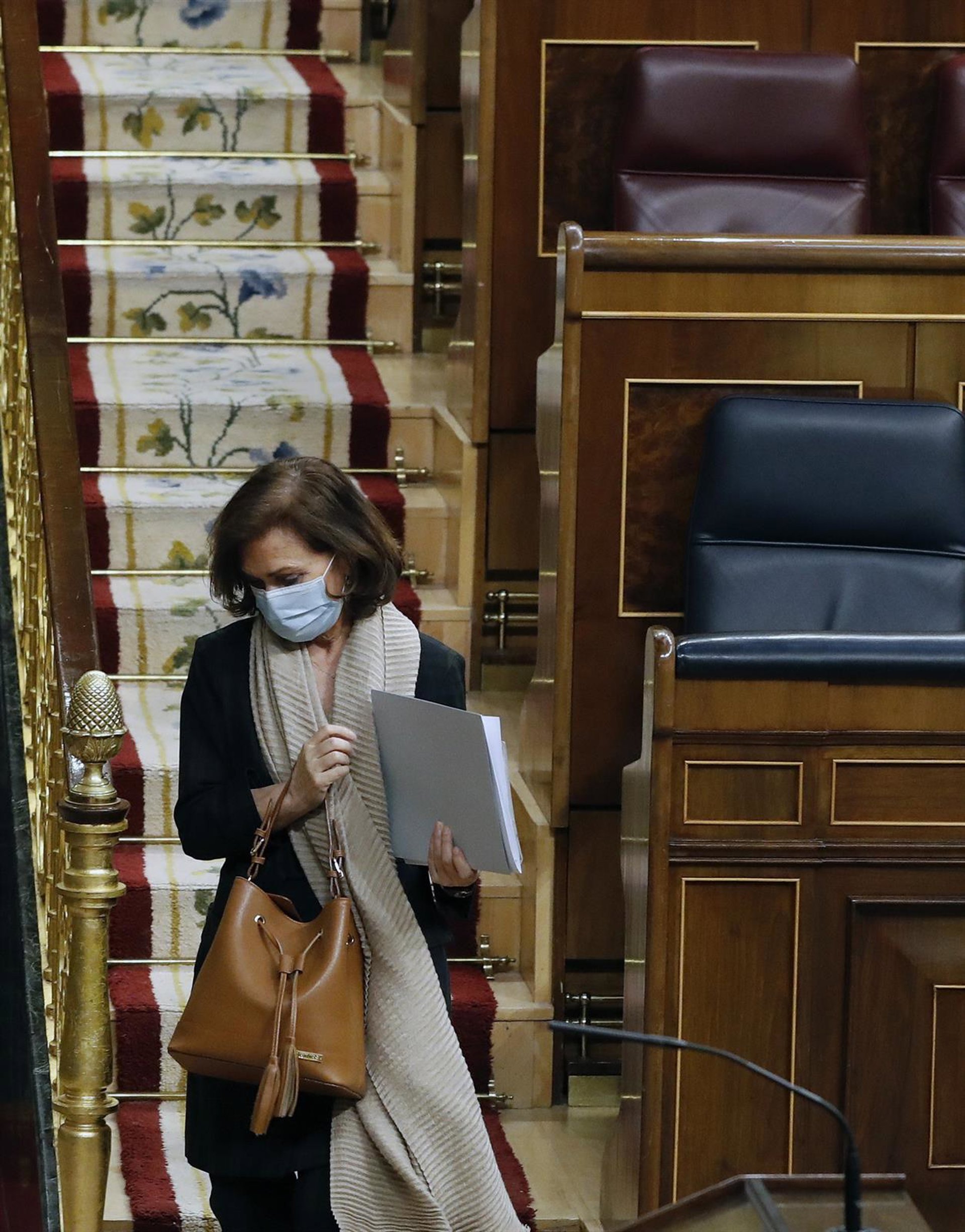 La vicepresidenta primera del Gobierno, Carmen Calvo, sale del hemiciclo durante el pleno del Congreso este miércoles donde se autorizará otra prórroga del estado de alarma solicitada por el Gobierno, en Madrid (España), a 6 de mayo de 2020. - Pool