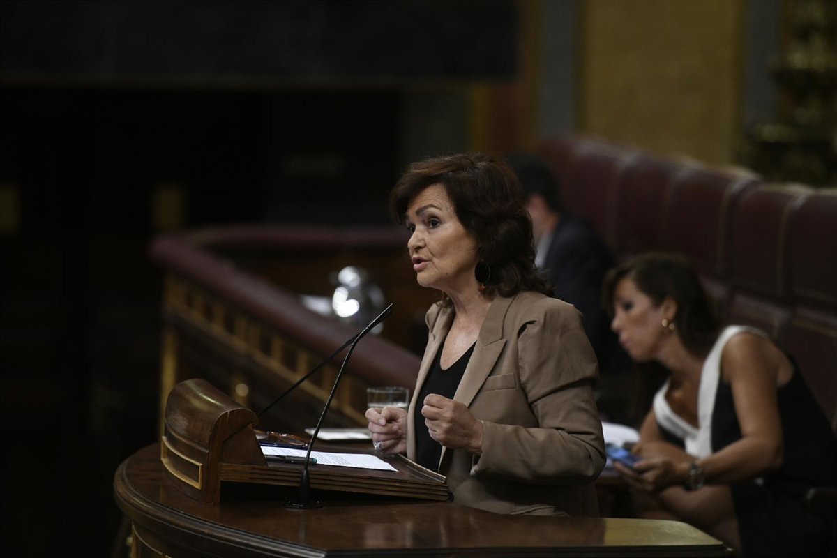 En declaraciones a los medios de comunicación en los pasillos del Congreso, la 'número dos' del Gobierno ha tachado de "lamentable" y "vergonzoso" que el mismo día en que el Congreso ha convalidado el decreto ley para exhumar los restos del dictador Francisco Franco del Valle de los Caídos "las derechas azul y naranja" quieran hablar de la tesis doctoral de Sánchez.