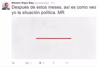 "Después de estos meses, así es como veo yo la situación política", ha escrito Rajoy, firmando con sus iniciales --lo que indica que el tuit es suyo, no de su equipo-- y acompañando el texto con la imagen de un rectángulo blanco en cuyo centro figura una línea roja horizontal. El mensaje de Rajoy ha recibido 160 retuits en los primeros 10 minutos.