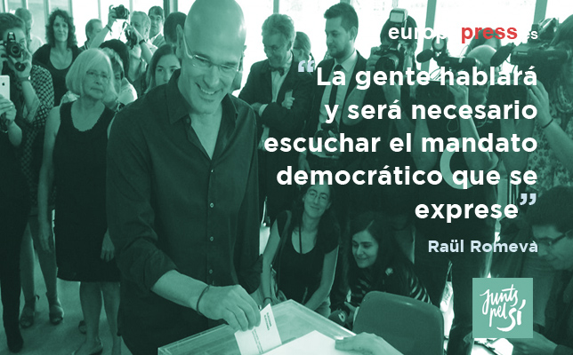 Raül Romeva, el cabeza de lista de Junts Pel sí, afirmó que la jornada es especial por permitir que la gente "diga cuál es su proyecto y su visión de futuro del país". También el actual presidente de la Generalitat, Artur Mas, ha afirmado este domingo que el 27S es una gran victoria de la democracia pese a "los muchos obstáculos" por parte del Gobierno central.