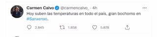 La exvicepresidenta Carmen Calvo ha ironizado este viernes con la subida de temperaturas que se registra en toda España destacando especialmente el "gran bochorno" previsto en la localidad pontedevedresa de Sanxenxo, primera escala de Juan Carlos I en su regreso al país y donde ha sido recibido con 'vivas al rey'.