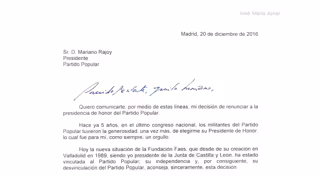 "Quiero comunicarte, por medio de estas líneas, mi decisión de renunciar a la presidencia de honor del Partido Popular.