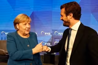 El presidente del Partido Popular, Pablo Casado, y la canciller alemana, Angela Merkel, asisten a un encuentro de líderes europeos del PPE en Berlín. - PP