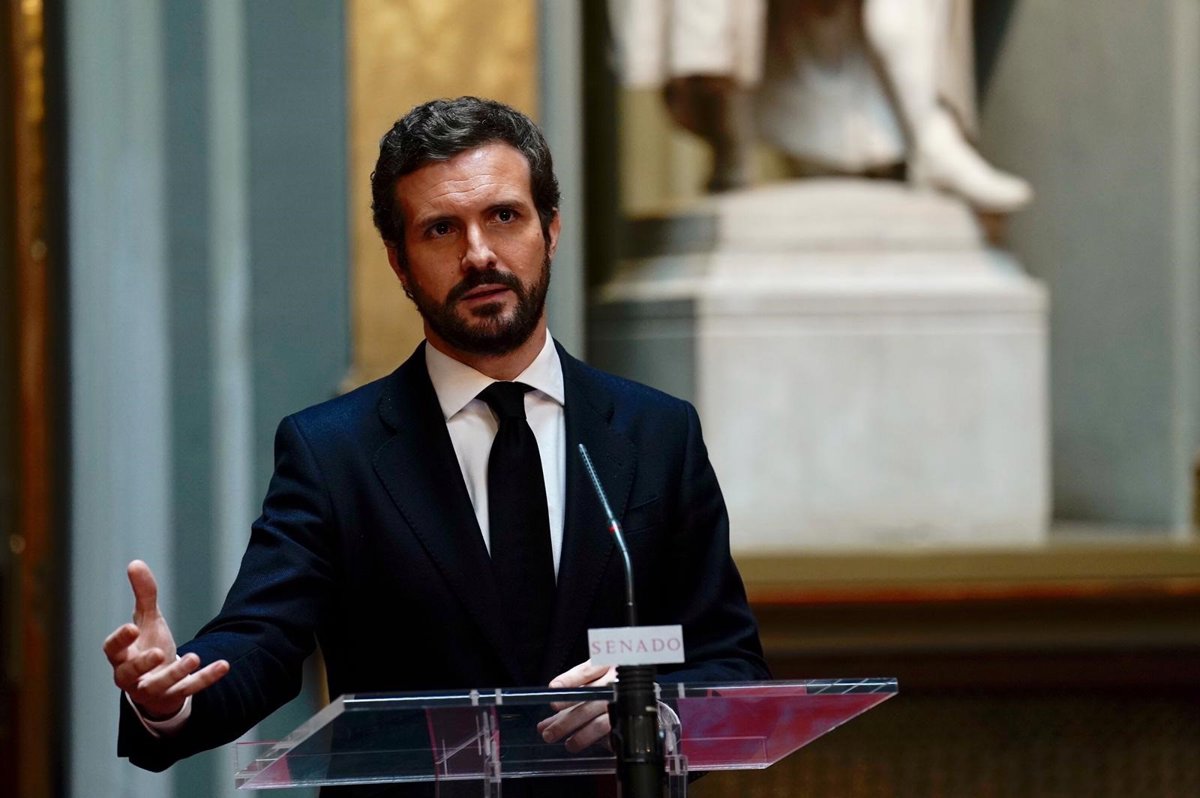 El presidente del PP, Pablo Casado, en el Senado tras reunirse con los presidentes y consejeros del PP que asisten a la Comisión General de Comunidades Autónomas. En Madrid, a 30 de abril de 2020. - DAVID MUDARRA (PP)