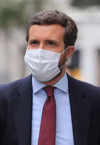 El presidente del PP, Pablo Casado, a su llegada a la Jornada sobre Sociedad y Sanidad 'Reformas en políticas y gestión sanitarias', a 8 de abril de 2021, en Madrid, (España). - Isabel Infantes - Europa Press