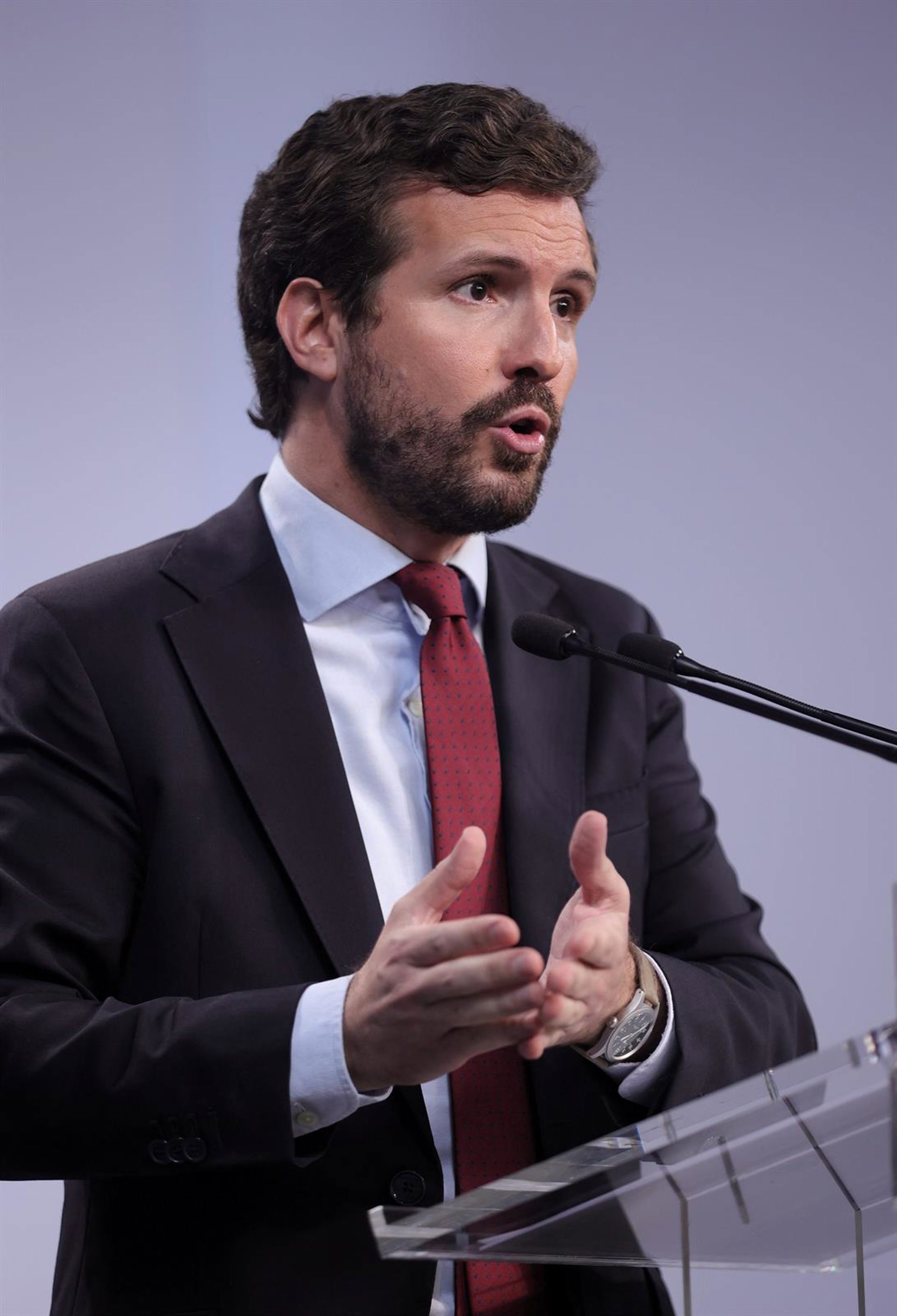 El presidente del PP, Pablo Casado, durante una rueda de prensa en la sede del partido, a 29 de julio de 2021, en Madrid (España). La comparecencia ha tenido lugar después de otra del presidente del Gobierno. - Eduardo Parra - Europa Press