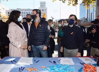 El presidente del Partido Popular, Pablo Casado, la presidenta de la Comunidad de Madrid, Isabel Díaz Ayuso, y el alcalde de Madrid, José Luis Martínez-Almeida, participan en una recogida de firmas en la caseta instalada por el PP en una manifestación d - Eduardo Parra - Europa Press